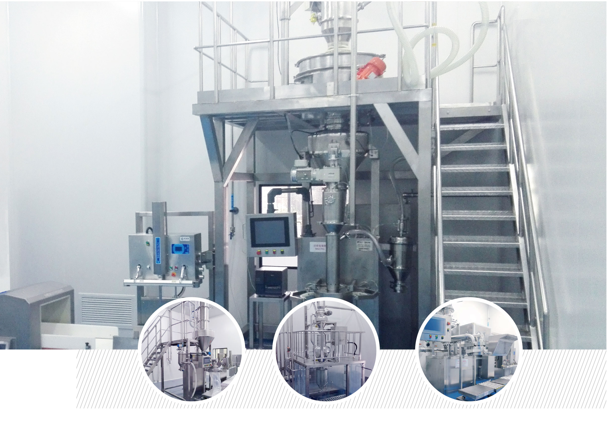 无尘粉碎系统 脉冲式气流混合系统 自动提升料斗混合机 无尘投料站 吨袋卸料机 真空输送设备 计量分装机 CIP清洗单元 代理设备—干法制粒机